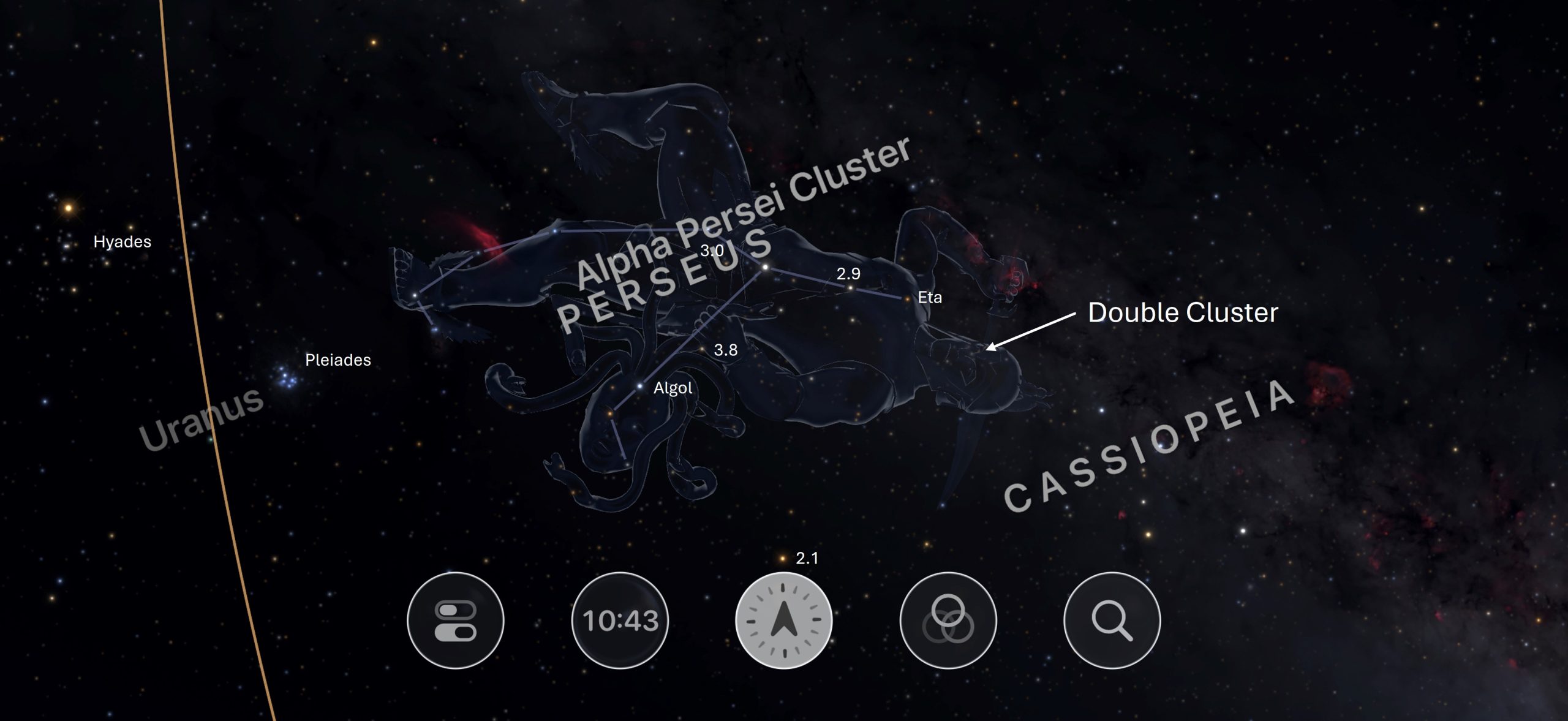 Hyades, Pleiades, Perseus and Cassiopeia (image obtained from “Sky Guide” version 12.0.8 for iPhone by Fifth Star Labs LLC)